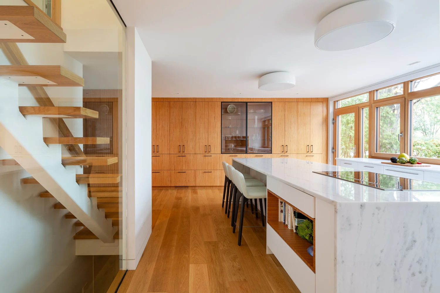 Interior view of white marble kitchen island, wood cupboards and flooring, modern floating staircase with glass bannister, and bar seating area