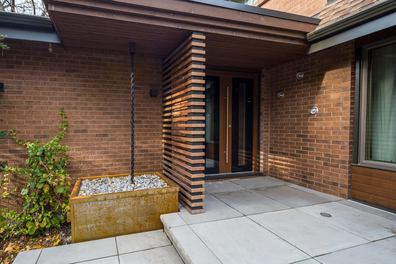 Front entrance view of new zen additions showing wooden divider detailing, natural wood plant box, cement tiling, and greenery